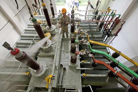 此圖是浙江杭州蕭山110千伏紅山變電站,國網(wǎng)杭州市蕭山區供電公司工作人員正手持高壓水槍?zhuān)瑸?/span>110千伏2號主變壓器沖洗。這種為變壓器“洗澡”的新模式給變壓器的維護工作帶來(lái)了方便,確保變壓器的可靠運行。當然在沖洗時(shí)也需要注意人身安全。
