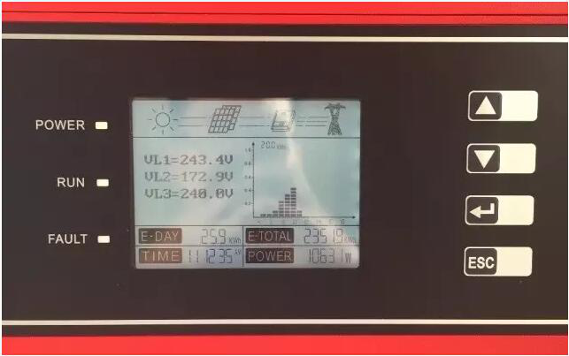 逆變器交流側顯示電壓為VL1=243.4V、VL2=172.9V、VL3=248.0V,明顯第二相電壓異于正常值;關(guān)閉逆變器,測量配電箱電網(wǎng)電壓為VL1=238.1V, VL2=170.5V,VL3=227.5V。排除光伏的影響,確定為電網(wǎng)電壓偏低的故障。當地電網(wǎng)三相極不均衡,各居民用戶(hù)在B相電網(wǎng)接入負載負荷過(guò)大,然后加劇了B相線(xiàn)的壓降,需要去供電局溝通處理,努力提高當地電網(wǎng)質(zhì)量,并盡量保證各家庭接入電網(wǎng)的三相平衡。